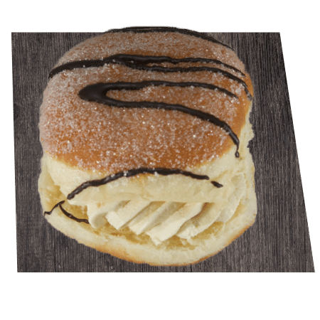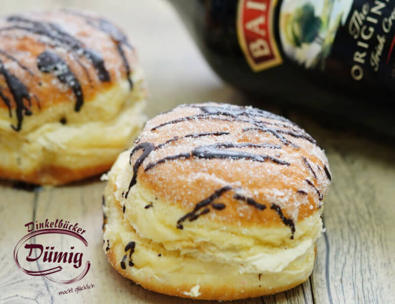 Lockerer Hefeteig schwimmend im heißen Fett gebacken, getränkt mit original Baileys und gefüllt mit Baileyssahnekreme. Mit Kristallzucker und feinen Schokofäden verziert.