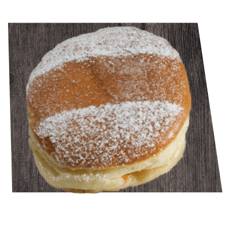 Locker frittierter Hefeteig gefüllt mit Hagebuttenkonfitüre und mit Puderzucker über gestaubt.