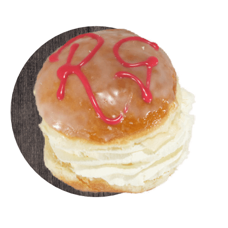 Leichter Hefeteig schwimmend im heißen Fett gebacken, gefüllt mit Vanillesahne und roter Grütze. Überzug mit dünner Fondantschicht und dekoriert mit roten Fondantbuchstaben RG.