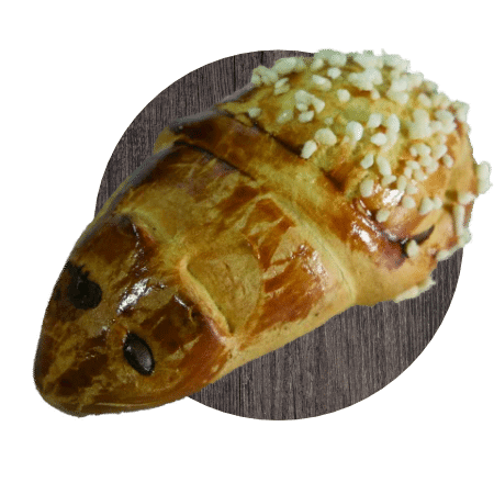 Dinkelmehl, Wasser, Butter, Zucker, Hefe, Vollmilchpulver, Vollei, Meersalz, Backmalz (Dinkelmalzmehl), Zitronenraps, Backpulver; Die Augen aus Schokolade; Deko: Hagelzucker.