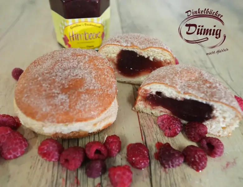 Leichter frittierter Hefeteig gefüllt mit Himbeerkonfitüre in Zimtzucker gewälzt.