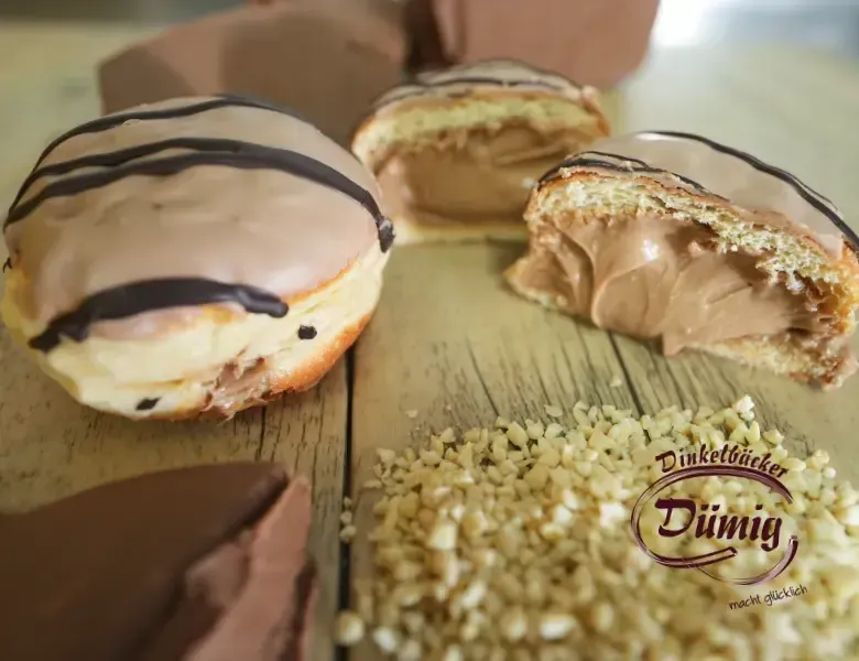 Leichter Hefeteig schwimmend im heißen Fett gebacken, gefüllt mit feinem Haselnussnougat. Überzug aus Haselnussglasur mit dunklen Streifen aus Pralinenmasse filiert.