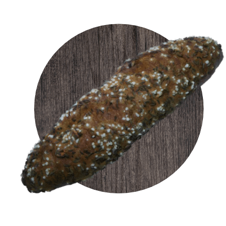 Dümigs Dinkelspitzl – Salz sind länglich, rustikal gewickelt und haben eine lockere Krume mit zartsplitender Kruste. Auf die Oberfläche ist grobes Salz mit Kümmel aufgestreut.