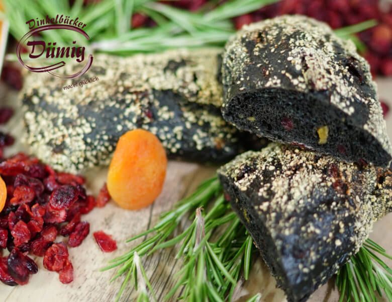 Dinkelmehl, Wasser, Aprikosen getrocknet, Cranberry, Kartoffelflocken, Meersalz, Aktivkohle, Backmalz, Hefe, Rosmarin. Dekor: Quinoa.