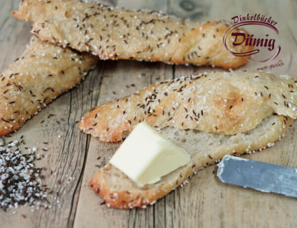 Glänzend braune Kruste und saftige grobporige Krume zeichnen die Dümig Seele aus. Die Form ist länglich und nie gleich durch das Ausheben der Stücke mit der nassen Hand. Die Seele ist leicht mit Salz und Kümmel bestreut.