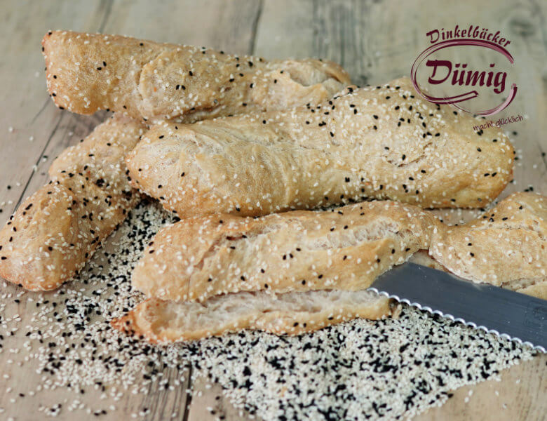 Glänzend braune Kruste und saftige grobporige Krume zeichnen die Dümig Seele aus. Die Form ist länglich und nie gleich durch das Ausheben der Stücke mit der nassen Hand. Die Seele ist leicht mit Sesam und Schwarzkümmel bestreut.