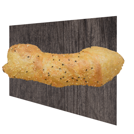 Dinkelmehl, Wasser, Meersalz, Backmalz, Hefe. Dekor: Sesam und Schwarzkümmel.